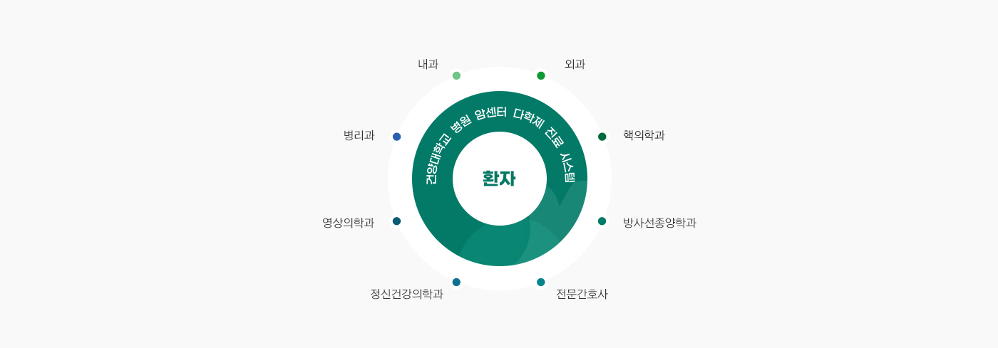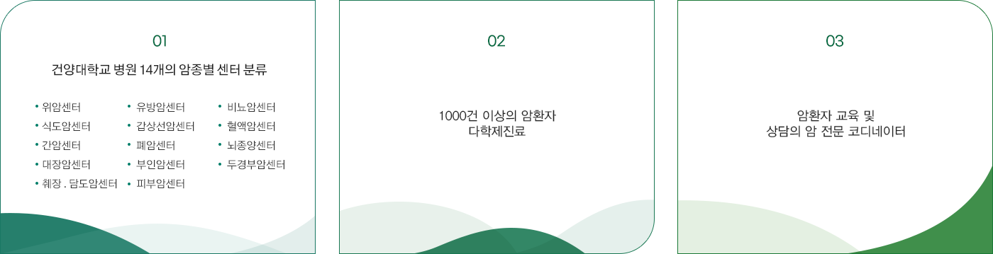암센터에는 위암팀을 비롯해 식도암, 간암, 췌장·담도암, 대장암, 유방암, 갑상선암, 폐암, 부인암, 비뇨암, 뇌종양, 두경부암, 피부암 등 14개 전문팀이 개설되어 있습니다. 이에 소화기내과, 호흡기내과, 혈액종양내과, 산부인과, 비뇨기과, 흉부외과, 방사선종양학과, 피부과 등 관련과 외래진료도 암센터내에서 이루어집니다.