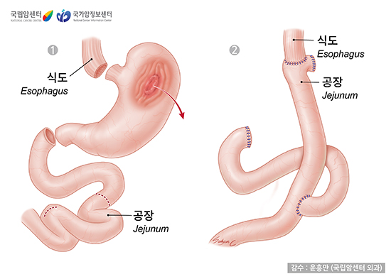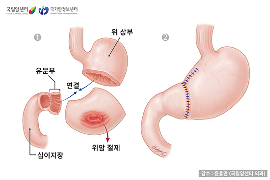 그러나 이 수술은 림프절 절제 범위가 제한되므로 조기위암일 때만 제한적으로 고려할 수 있습니다. 식도와 남은 위를 바로 연결하면 역류가 발생할 수 있는데, 이를 방지하기 위해 최근에는 식도에서 공장을 먼저 연결한 뒤 공장에 남은 위를 연결하는 수술(double track reconstruction)도 시행되고 있습니다.
