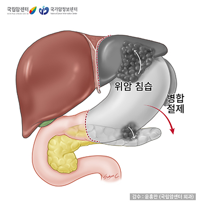 합병절제술이라고도 하며, 위뿐 아니라 주위의 다른 장기도 같이 떼낸다는 뜻입니다. 위암이 위벽을 뚫고 나와 간, 췌장, 비장, 대장 등 근처의 장기를 침범했을 때 위장과 함께 침범된 장기들을 같이 제거하는 수가 있습니다. 침범된 장기를 합병절제 했을 때 그렇지 않은 경우에 비하여 치료 효과가 좋은 것으로 알려져 있습니다. 단, 다른 곳에 원격 전이가 없고, 대동맥 주위의 림프절에도 전이가 되지 않았을 때에 한하여 시행합니다. 또한 수술 범위가 커서 수술 후 합병증이 생기는 경우가 많으므로, 환자의 상태를 고려하여 수술 여부를 신중하게 결정해야 합니다.