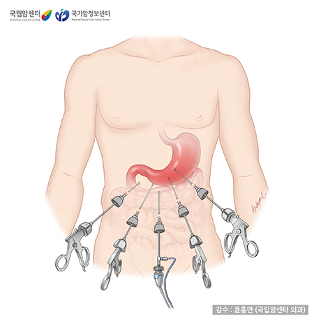 일본 오이타대(大分大) 기타노 세이고(北野正剛) 교수 등에 의해 1994년 처음 보고된 이래로 위암에서도 복강경(laparoscope)을 이용한 수술이 이루어지고 있습니다. 복강경수술이란 배를 크게 열지 않고 작은 구멍들만을 내어 몇 개의 관(투침관)을 복강에 삽입한 뒤, 그것을 통해 복강경 및 수술기구들을 넣어 모니터 화면을 보면서 수술하는 방법입니다. 따라서 기존의 개복수술에 비해 통증이 적고 흉터가 작으며 회복이 빠른 장점이 있습니다.