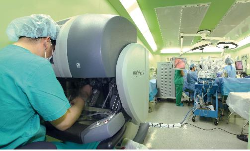 복강경수술처럼 아직 조기 위암의 경우에만 시행하고 있는 로봇수술은 2005년 처음 한국에 도입된 이후 시행 건수가 점차 증가해 왔습니다. 복강경수술의 단점을 극복한 방법으로, 수술 기구를 복강 안에서 여러 각도로 자유롭게 꺾을 수 있고 3차원 영상을 보면서 하기 때문에 보다 정밀한 수술이 가능합니다. 그러나 장비의 가격이 비싸고, 아직 검증이 충분하게 이루어지지 않아서 보험 적용이 되지 않기 때문에 고액의 수술비를 환자가 부담해야 한다는 단점이 있습니다. 또한 일반적인 복강경 수술에 비하여 재원 일수, 합병증 등의 임상적 장점이 아직 입증되지 않은 상태로 위암수술에서 로봇 수술의 적용에 관해서는 더 많은 연구가 필요한 상태입니다.