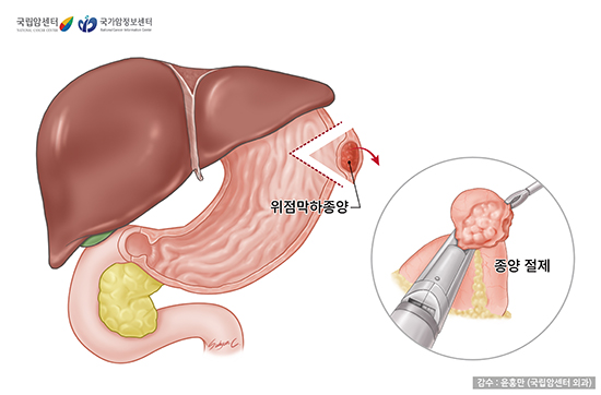 조기 위암 중에서 점막에 국한되어 있으며 크기가 2cm이내로 작고, 세포의 분화도가 좋은 암은 내시경을 이용한 절제로 치료할 수 있습니다. 이를 내시경적 점막하박리술이라 하는데, 수면내시경 방식으로 30~60분 정도 걸립니다. 내시경으로 병변 바로 아래에 생리식염수를 주사하여 위점막을 부풀리고, 내시경 기구들을 이용하여 병변을 잘라내는 것입니다. 암을 도려내어 생긴 궤양은 한 달쯤 위궤양 약을 복용하면 아물고, 시술 후 2~3일 만에 퇴원할 수 있습니다. 이 치료법은 정상적인 위를 그대로 지니고 생활할 수 있어서 삶의 질이 손상되지 않는다는 것이 장점입니다.