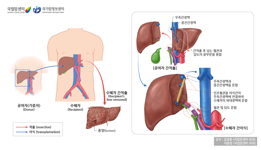 간 이식은 뇌사자 간 이식과 생체 간 이식으로 나뉩니다(뇌사자 간 이식에서는 간 전체를 이식하기도 하고 부분만 이식하기도 합니다. 생체 간 이식은 당연히 부분 이식입니다). 뇌사자의 장기 기증이 절대적으로 부족한 우리나라에서는 생체 간 이식이 주로 시행되고 있습니다. 이는 건강한 정상인의 간 일부분을 수술로 떼어 내서 간질환 환자에게 이식하는 방법으로, 공여자(기증자)의 안전을 철저하게 고려해야 합니다. 공여자에게 수술 후 합병증이 발생할 수 있고, 중증 합병증으로 사망까지 한 예도 있기 때문입니다.