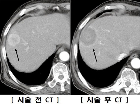 크기가 2cm 이하인 종양에서는 이들 두 치료법의 결과에 큰 차이가 없지만, 2cm 이상인 종양에는 에탄올주입술보다 고주파 치료술이 효과가 큰 것으로 알려졌습니다. 그러나 고주파열치료술은 에탄올주입술에 비해 시술 후 합병증이 좀 더 많고, 종양 주위에 혈관이 있거나 종양의 위치가 대장‧담낭 등 다른 장기에 인접한 경우에는 효과적으로 치료하기가 어렵다는 단점이 있습니다.