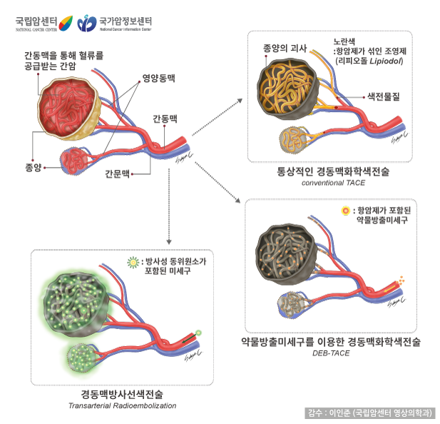 현재 간암으로 진단되는 환자들 중 대략 절반 정도는 수술이나 국소 치료술이 우선적으로 고려될 수 없는 여러 개의 종양, 혹은 혈관을 침범한 진행된 종양을 갖고 있거나, 간 기능이 매우 저하되어 있습니다. 이때 가장 흔히 사용되는 치료법이 경동맥화학색전술(經動脈化學塞栓術, transarterial chemoembolization, TACE, 이하 색전술)입니다. 이는 간암의 종괴(덩이)는 혈관이 잘 발달한 경우가 많다는 점을 이용하는 것으로, 종괴에 혈액을 공급하는 동맥을 찾아서 항암제에다 요오드 성분의 물질인 리피오돌(lipiodol, 지용성 조영제)을 혼합하여 주입하고는 그 혈관을 ‘색전물질’로 막아 버리는 방법입니다(‘색전’은 닫아서 막는다는 뜻입니다). 리피오돌을 혼합하는 까닭은 그것이 과혈관성 종양에 오래 머무르는 특성이 있기 때문입니다.