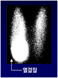 갑상선 기능과 갑상선 결절의 상태를 확인하는 검사입니다. 환자에게 방사성 요오드(iodine, 한자로는 ‘옥도/옥소’)를 먹게 하거나 방사성 원소인 과산화테크네튬(최초의 인공 원소인 technetium은 흔히 영어식으로 ‘테크네슘’이라고도 합니다) 등을 정맥 주사로 투여한 후 이 방사성 물질이 갑상선에 충분히 흡수될 때까지 일정 시간을 기다렸다가 감마카메라 같은 특수 카메라로 촬영합니다. 일반적으로 암인 경우에는 결절에서 갑상선호르몬을 만드는 기능이 없으므로 요오드 혹은 테크네튬 흡수가 감소하여 스캔 사진에 냉결절(동위원소가 없으므로 사진에서 하얗게 보이는 부분)로 나타납니다. 반면에 요오드나 테크네튬의 흡수가 증가하여 사진에서 검게 나타나는 열결절은 암일 가능성이 낮습니다. 냉결절로 나타나면 암일 가능성을 배제할 수 없으나 양성 결절도 냉결절로 나타나는 경우가 많기 때문에 갑상선 스캔은 다른 검사들에 보조적으로 사용합니다.