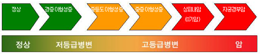 자궁경부 표면의 정상 상피세포에서 시작하여 미세한 현미경학적인 변화가 발생하는 자궁경부 상피내이형성증(정상조직과 암조직의 중간)을 거쳐, 상피 내에만 암세포가 존재하는 자궁경부상피내암(자궁경부암 0기)으로 진행하고, 이 단계에서 발견하지 못하여 치료하지 못하면 다시 침윤성 자궁경부암으로 진행합니다. 정상 상피세포에서 침윤암이 되는 과정은 수년 내지 수십 년에 걸쳐 서서히 진행됩니다.