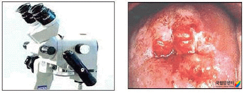 자궁경부세포검사나 육안 관찰에서 이상이 있으면 질확대경검사(colposcopy)를 시행하는데, 이는 자궁경부의 비정상 부위를 질확대경으로 확대하여 자세히 보는 것입니다. 외래 진료실에서 간단하게 검사할 수 있으며, 필요한 부위의 조직검사를 동시에 시행할 수도 있습니다.