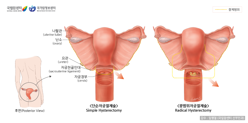 단순자궁절제술(simple hysterectomy)은 주로 전암성 병변인 상피내암이나 자궁경부암 초기에 사용하는 방법이며, 암이 침범한 자궁을 적출하는 수술입니다. 자궁을 질을 통해 적출하면 질식 단순자궁절제라고 하고, 복벽(腹壁)을 절개해서 적출하면 복식 단순자궁절제라고 합니다. 최근에는 미세침습방법으로 복강경이나 로봇 복강경을 이용하여 자궁을 제거하는 방법을 많이 사용하고 있습니다.