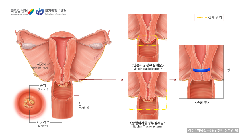 한편, 비교적 초기의 침윤성 자궁경부암 환자가 임신을 원한다면 광범위자궁경부절제술과 복강경을 이용한 림프절절제술을 시행하여 자궁을 보존하여 출산이 가능하게 합니다.