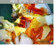 수술방사선복합요법(CORT)은 수술로 골반 벽에 있는 종양조직을 제거한 후 남은 종양조직에 근접치료(brachytherapy)를 하기 위한 유도관(guide tube)을 이식하고 복강 벽이나 대퇴부로부터 방사선치료를 받지 않은 자가조직을 골반 벽으로 이동하여 이식시킴으로써 복강 내의 장기들로부터 충분한 거리를 유지할 수 있도록 해 주는 수술입니다. 이렇게 함으로써 이전에 방사선치료를 했던 환자에게도 고용량의 방사선치료를 할 수 있게 해 줍니다. 이 수술도 방광, 자궁, 직장을 제거하고 인공항문이나 회장도관, 질 재건술 등을 시행합니다.