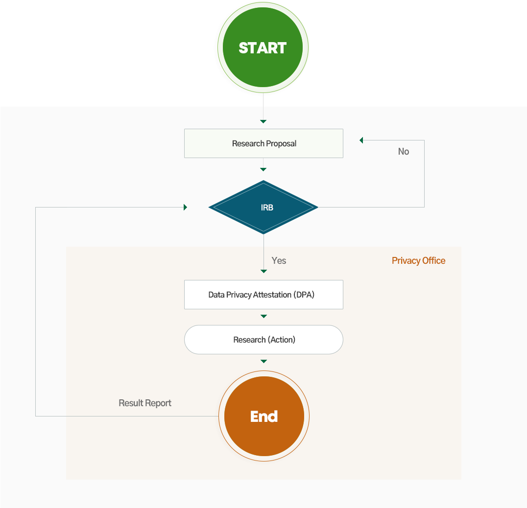 인간 대상의 임상연구를 계획하는 모든 연구자는 IRB 심의를 진행하여야 하며, 승인후에는 Data Privacy Attestation(DPA) 프로세스를 거쳐 지정된 Privacy Office에서 데이터 활용을 할 수 있습니다.