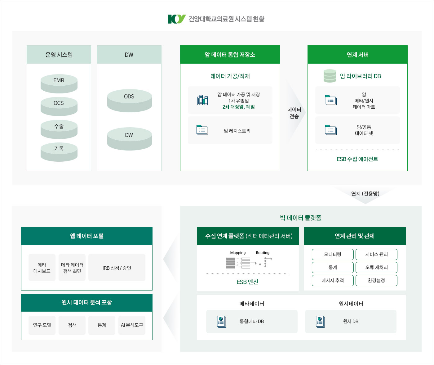암 데이터 통합 저장소에서 데이터 가공/적재(암 데이터 가공 및 저장, 1차 유방암 / 2차 대장암, 폐암 + 암 레지스트리)를 하고 연계서버로 데이터 전송을 합니다. 연계서버에서는 암 라이브러리 DB가 있는데 암 메타/원시 데이터 마트, 암/공통 데이터셋을 합니다.(ESB 수집 에이전트) 그리고 연계(전용망)를 통해 빅 데이터 플랫폼으로 들어갑니다. 여기서는 수집 연계 플랫폼(센터 메타관리 서버)에서 ESB엔진을 관리하고 연계 관리 및 관제(모니터링, 서비스 관리, 통계, 오류 재처리, 메시지 추적, 환경설정)을 합니다. 메타데이터는 통합메타 DB고 원시데이터는 원시 DB입니다. 최종적으로 웹 데이터 포털에 메타 대시보드, 메타 데이터 검색화면, IRB 신청/승인이 되고 원시 데이터 분석 포함(연구 모델, 검색, 통계, AI 분석도구)을 합니다.