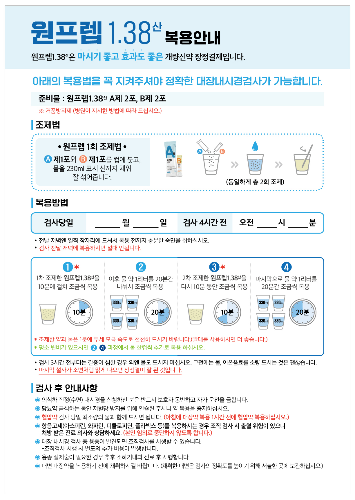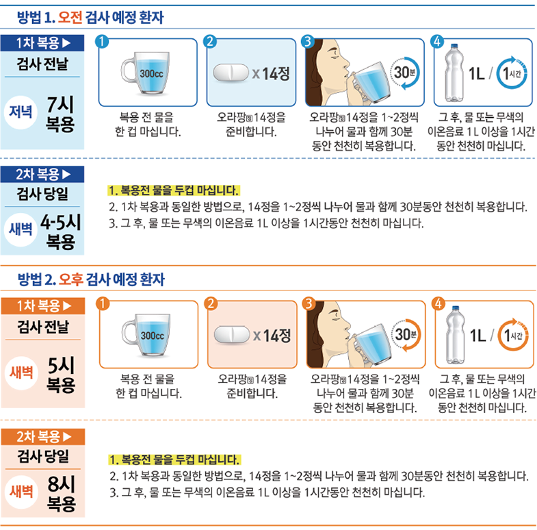 - 이후에는 물만 드시고 자정부터 금식하세요.