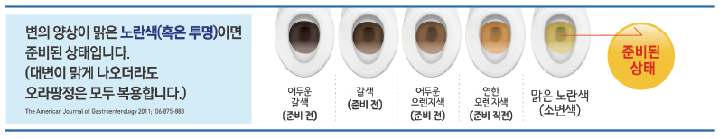 대장내시경 검사의 정확도는 장정결 상태에 따라 매우 달라질 수 있으며, 관장이 불충분한 경우 검사가 안될 수 있으므로 정확하게 시간과 용량을 지켜 대장약을 복용해 주십시오.