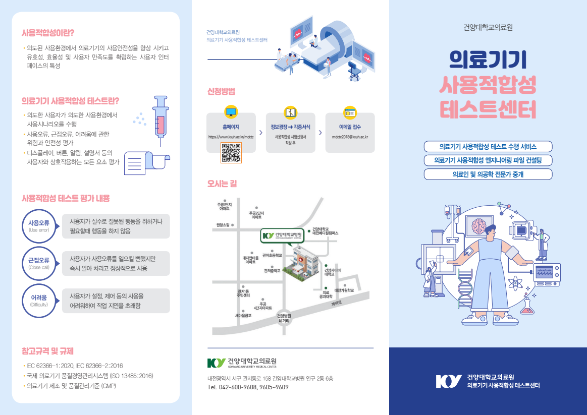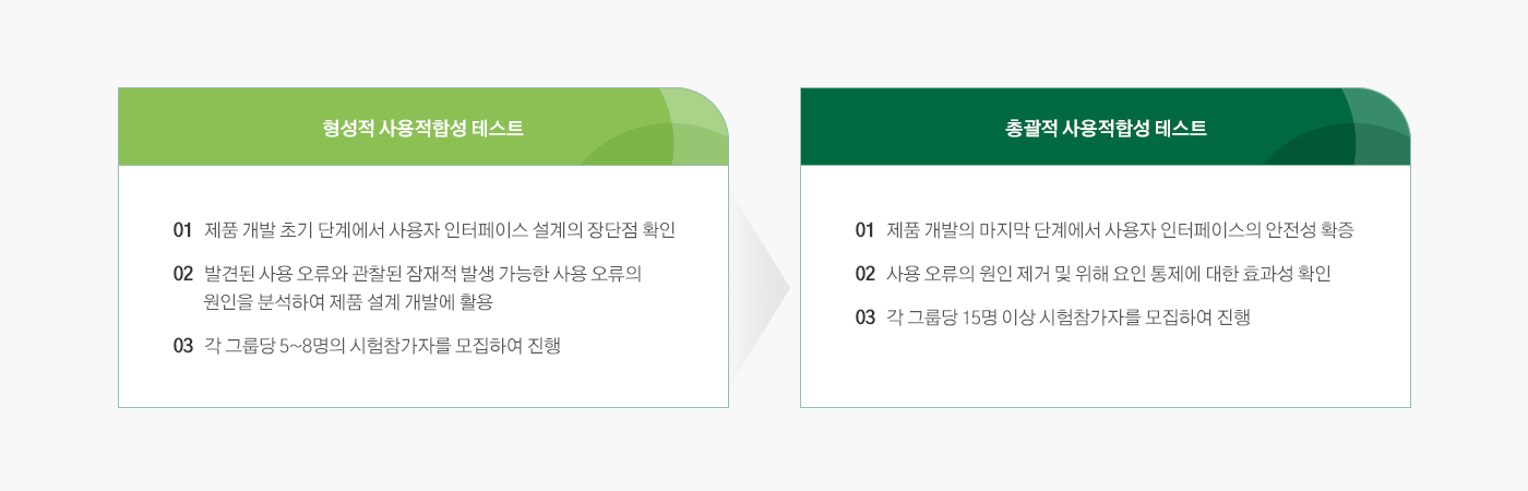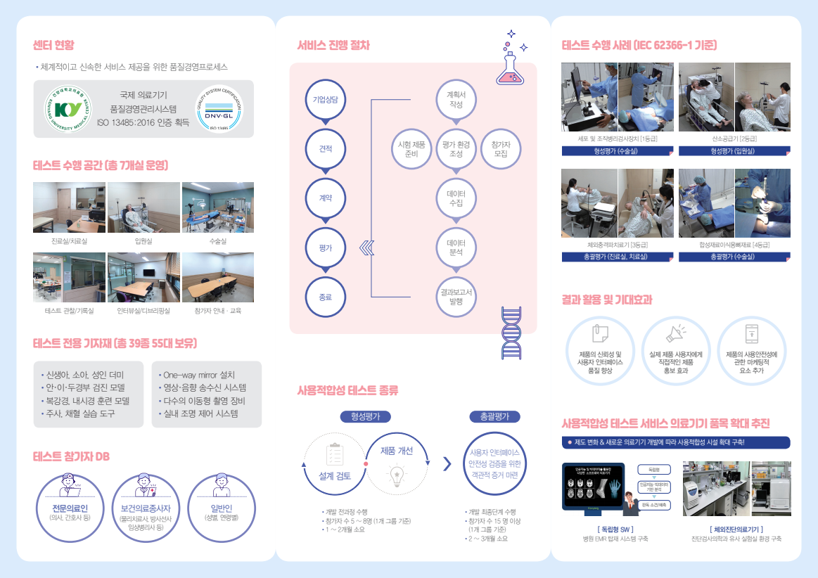 의료기기의 사용자 인터페이스 안전성 향상을 위한 형성적/총괄적 사용적합성테스트 수행 서비스를 제공하고 전문가 자문 중개와 의료기기 사용적합성엔지니어링 파일 컨설팅을 지원하고있습니다.